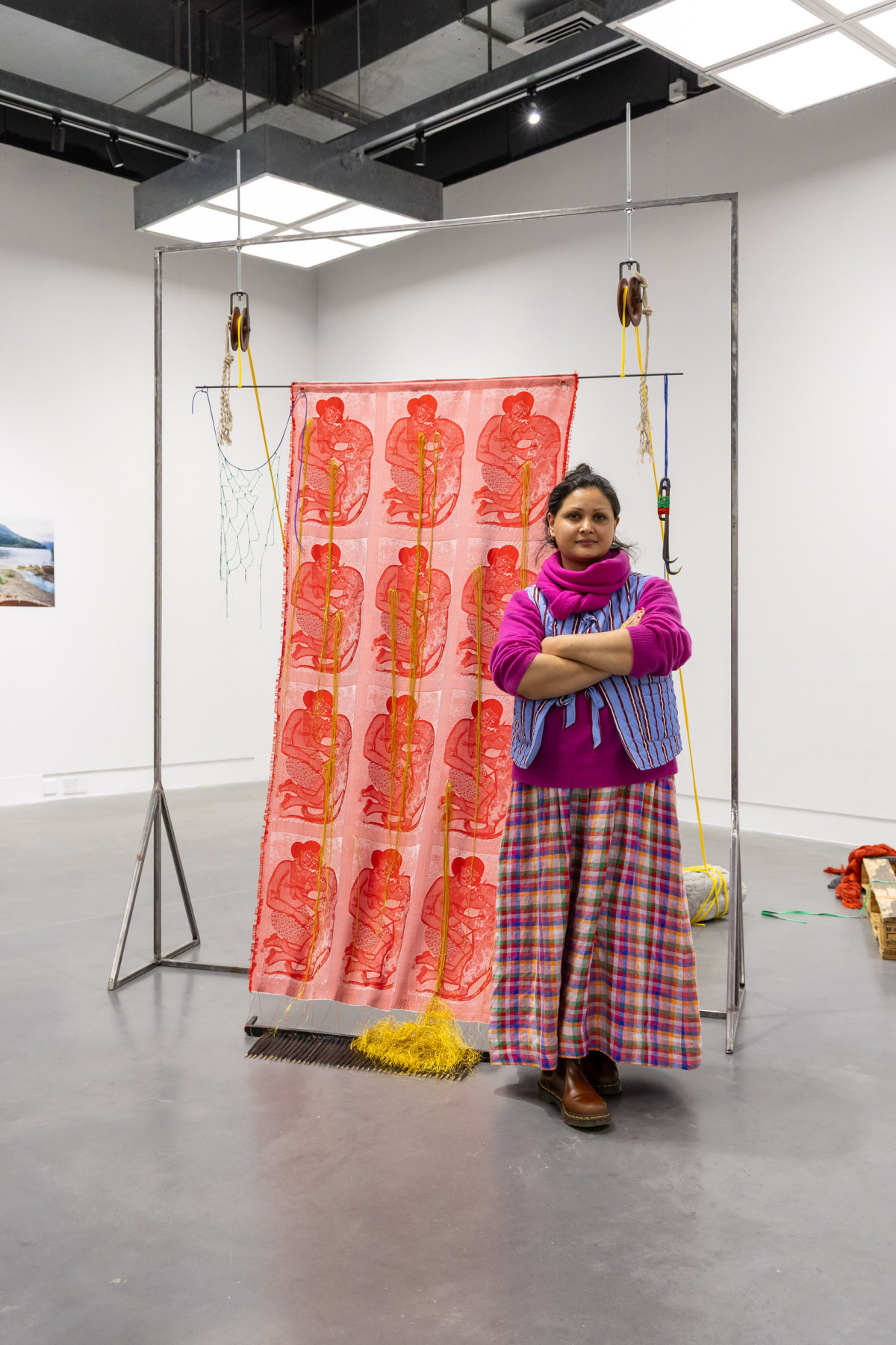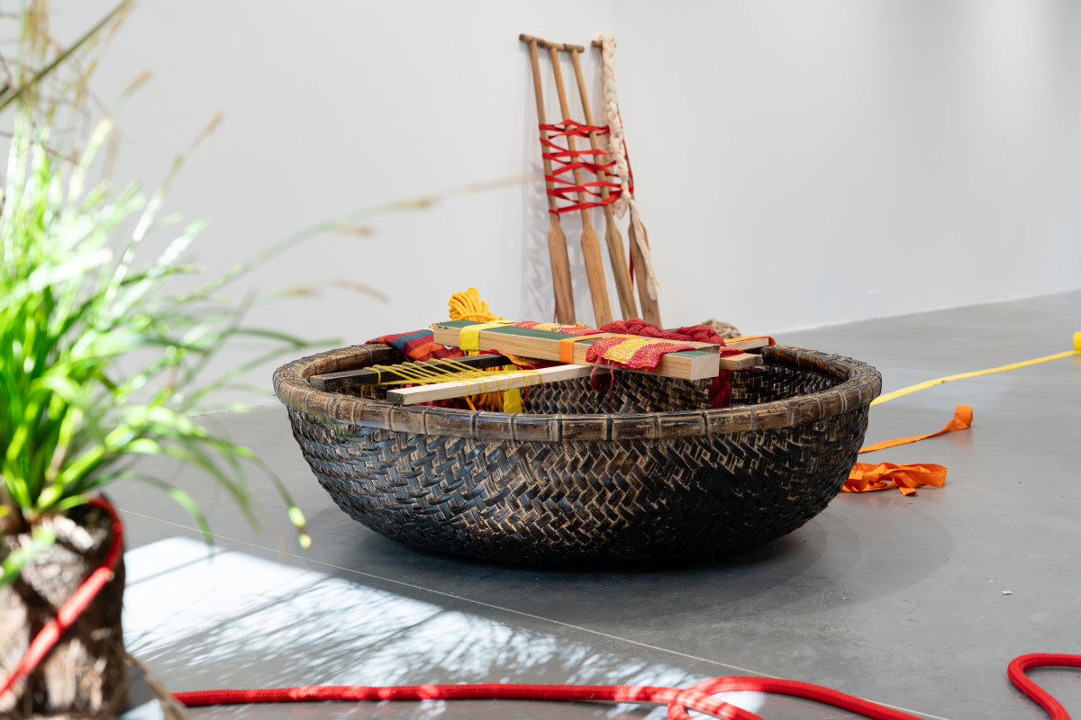 For their solo exhibition at the Hub, Kabir will present new artworks that respond to the context of our location beside the River Slea. Kabir will present new coracle artworks, painted and filled with materials such as cotton, silk, indigo, cochineal, jute, and flax, exploring the material histories and textile networks between Asia and Europe. Using the architectural steel structure of the exhibition space, they will connect their large-scale looms via thread and loom weights.