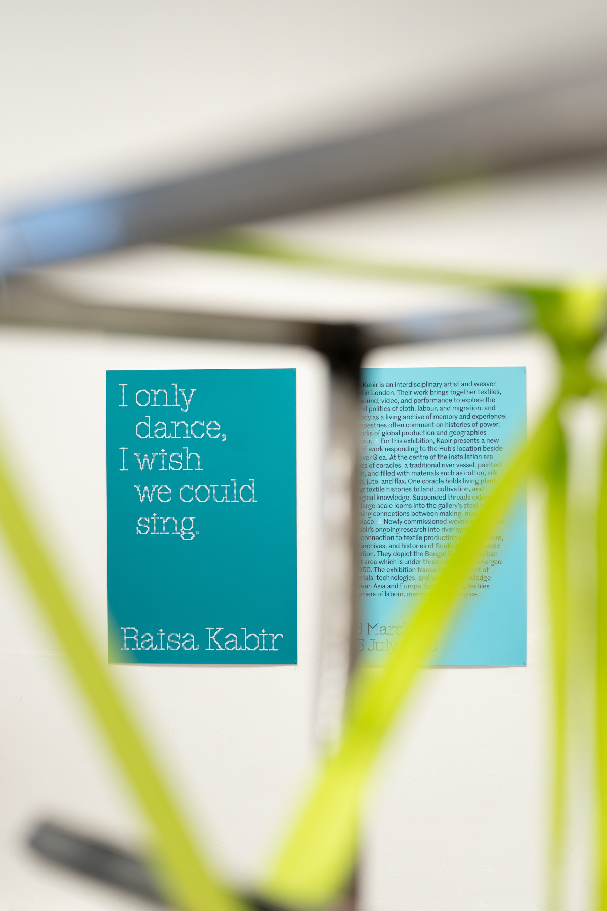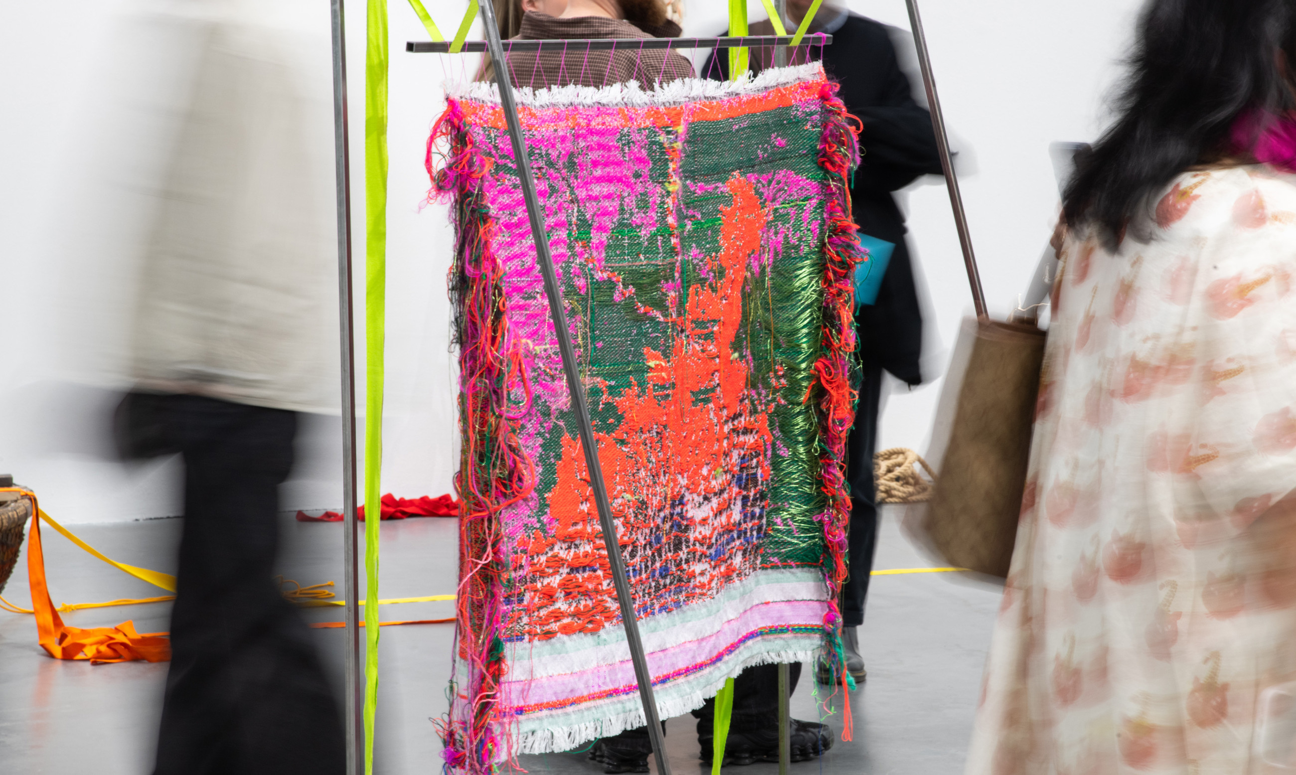 Raisa Kabir is an interdisciplinary artist and weaver based in London. Kabir utilises woven text and textiles, sound, video, and performance to materialise concepts concerning the cultural politics of cloth, labour, and embodied geographies. Their (un)weaving performances comment on power, production, disability, and the queer brown body as a living archive of collective trauma.